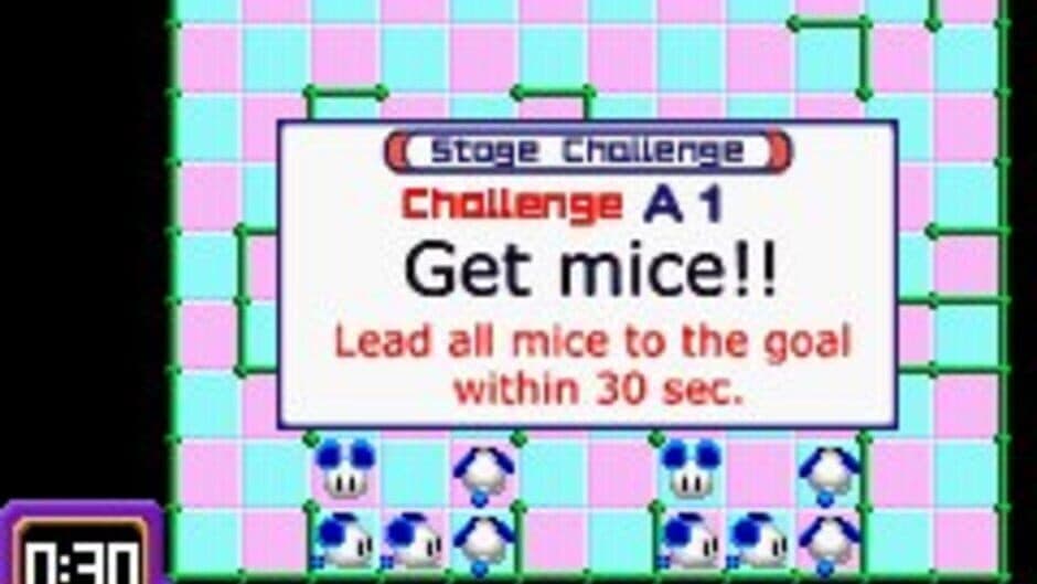 The object of the game is to guide one or more mice ("ChuChus") around a board into one or more goals while avoiding cats ("KapuKapus") roaming the board. The mice and cats all move in predictable paths by always turning right when hitting a wall head on, by following corners or by turning around when in a dead end. ChuChu Rocket!'s multiplayer mode revolves around up to four players placing arrows on the level at once, trying to direct mice into their own rockets and cats into other players' rockets (any cat that reaches a rocket removes a percentage of the mice within). Each player can only have three arrows on-screen at a time and cannot place them on other players' arrows or their own arrows. Arrows would disappear over time, or could be removed by a player placing his fourth arrow (which would eliminate the first arrow placed, thus leaving three). Although a simple concept, this quickly becomes frenetic with the relentless speed of the mice and four players fighting over them.