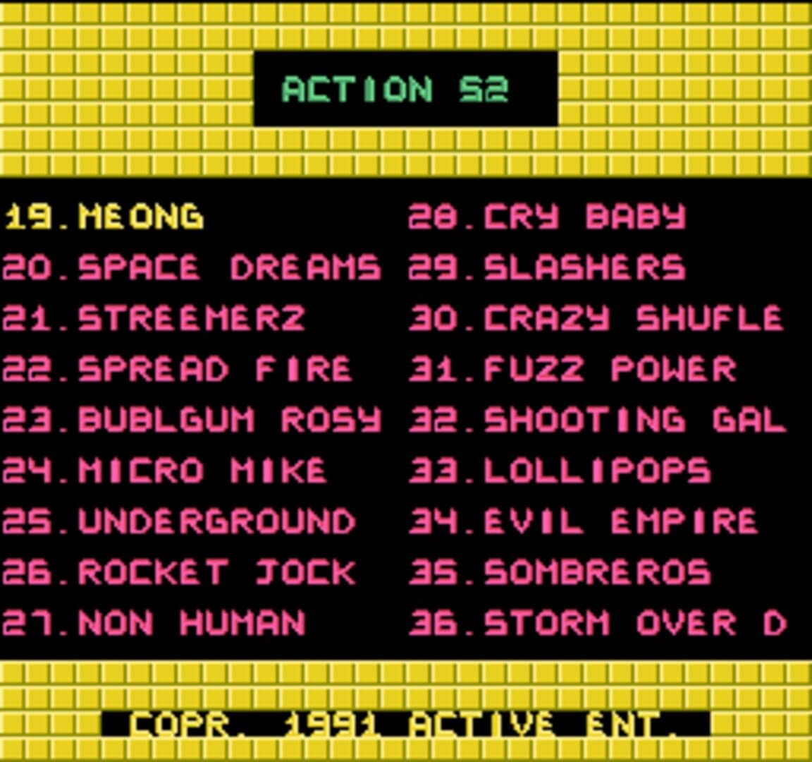 Get 52 "New and Original" exciting games for play on your Nintendo System. Try to get Billy Bob out of the Dungeon where he is imprisoned, to save MARYLOU. Go along with the ACTION GAMEMASTER as he changes into one of the fearsome CHEETAHMEN to try to defeat all of the ACTION 52 evil attackers. These two games plus an additional 50 games on this one "Multi-GamePak" will keep you entertained for a long time.