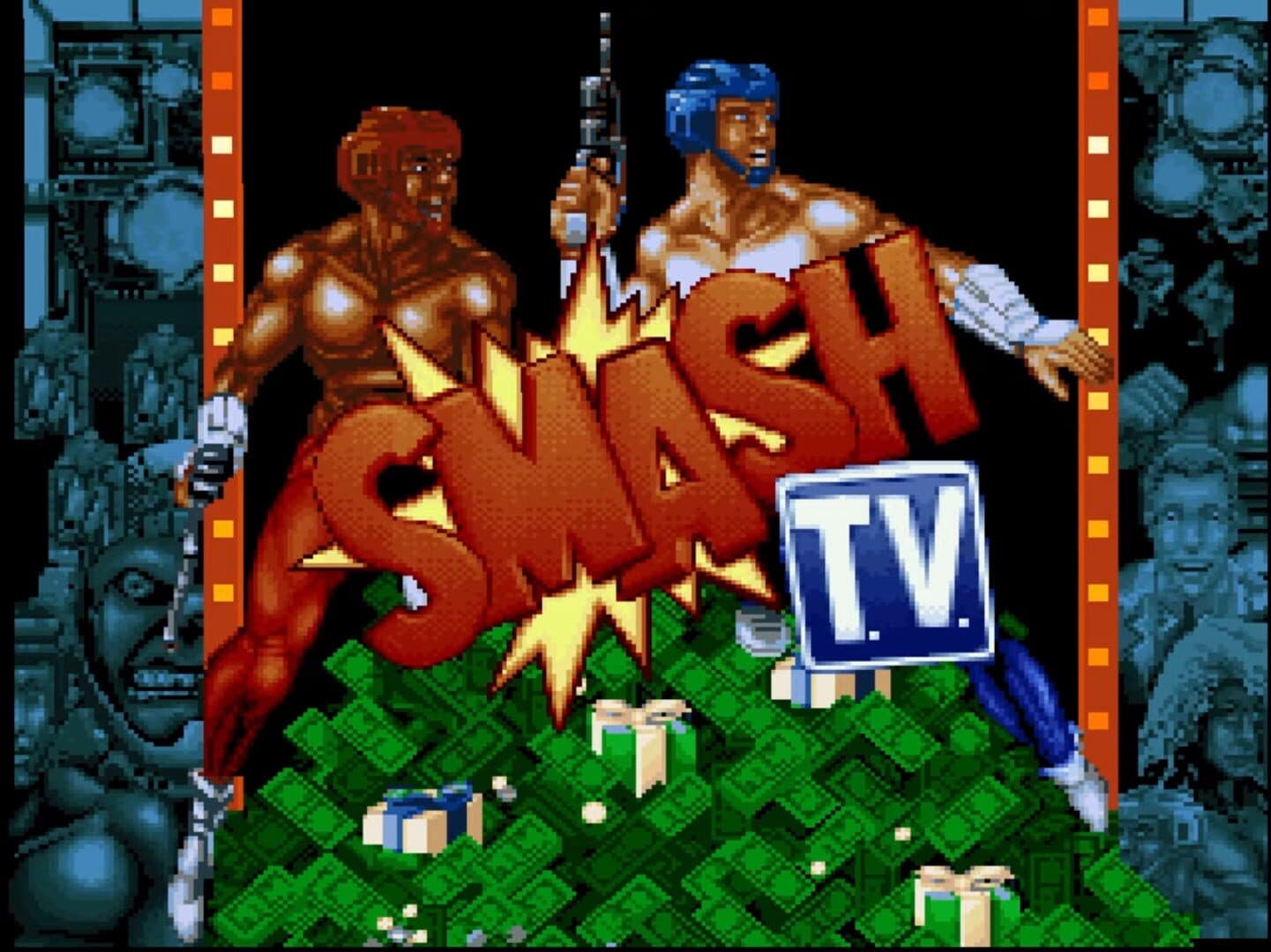 The Super Nintendo Entertainment System and Super Famicom port of Smash T.V. Smash T.V. was an arcade game created by Eugene Jarvis and Mark Turmell for Williams released in 1990. It is a dual-stick shooter in the same vein as its predecessor, Robotron: 2084 (also produced by Jarvis). As in the previous game, players battle waves of enemies by using guns. The plot of Smash TV revolves around a futuristic game show in which players compete for various prizes as well as their lives. As the Super Nintendo doesn't have dual stick controls, the ABXY buttons are used to aim the player's gun instead - for a total of 8 possible directions.