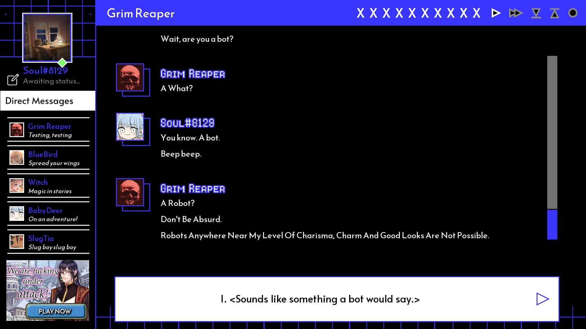 Fight against & romance the one hunting for your soul in A Date with Death, a romance chat simulator where you date(?) the Grim Reaper himself. Create your own character, decorate your apartment, and chat away with the charming yet dangerous Grim Reaper through text and video calls.