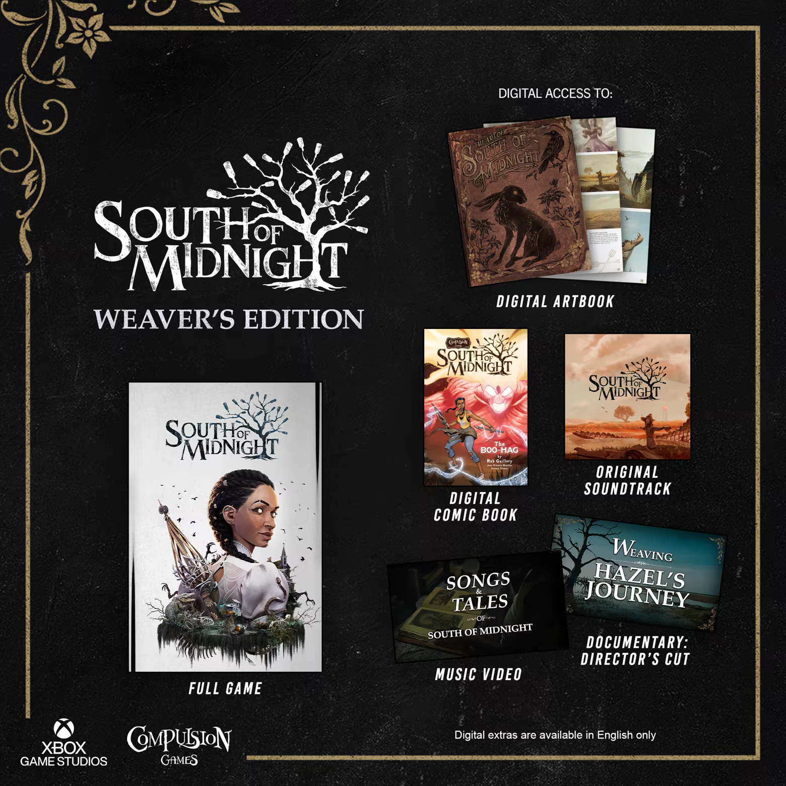 WEAVER’S EDITION: Immerse yourself in the macabre and fantastical world of South of Midnight. The Weaver’s Edition brings together the full game and its additional digital content (in English), celebrating the craft, music, and stories that shaped the game’s journey: · South of Midnight Artbook · Original Soundtrack composed by Olivier Deriviere · The Boo-Hag Comic book by Rob Guillory · Music Video: Songs & Tales of South of Midnight · Documentary: Weaving Hazel’s Journey, Director’s Cut