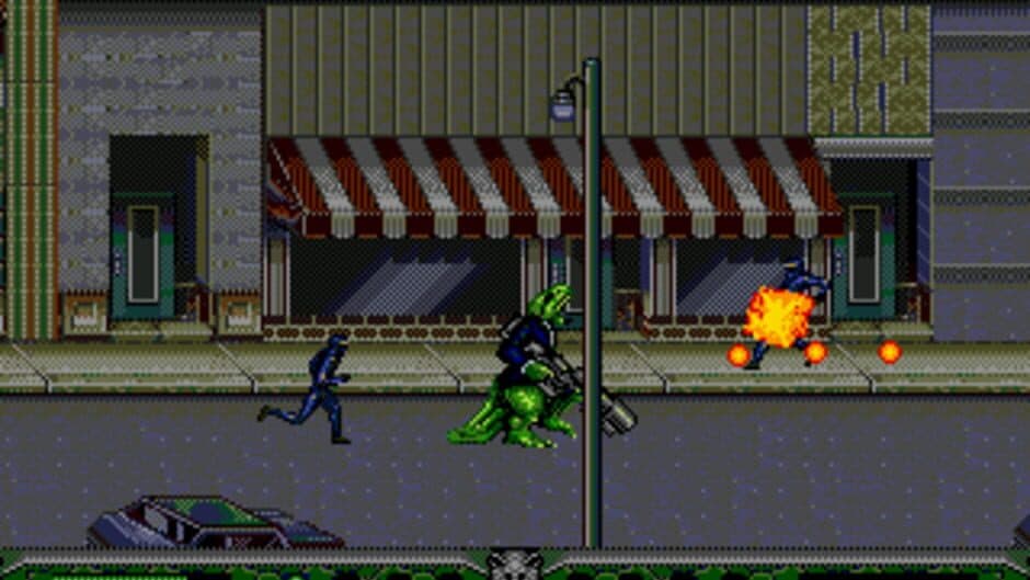 Unknown monsters and weird robotic creatures attack the Earth. For some reason, the only ones who can stop the invasion are the three Dinosaurs for Hire: Archie, a tyrannosaurus rex and their leader; the triceratops Lorenzo, lover of fine food, fine wine, and fine clothes, and the one-eyed, unpredictable stegosaurus Reese. Each dino has its own strengths and weaknesses. You guide the dinosaur of your choice through the platform levels of the game. You are equipped with a gun: tons of enemies will attack you from all the sides, so your best bet will be walking with the fire button pressed down. You can shoot to all the directions and also engage in melee combat when the enemy is too close. Each level has a boss enemy waiting for you in the end. There is also a cooperative two-player mode.